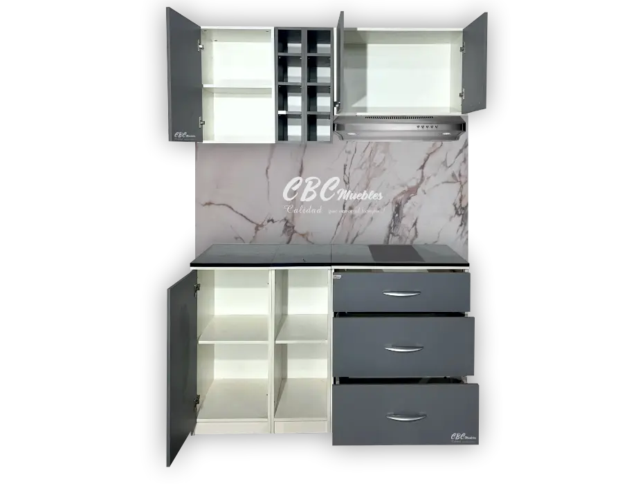 - La parte inferior cuenta con una mesada fórmica de color oscuro con un espacio para colocar anafe de hasta 60 cm 2 hornallas o 70 cm hasta 4 hornallas y un zócalo con patitas regulables, con una altura de 90 cm y una profundidad de 52 cm.