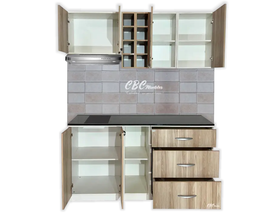 - La parte inferior cuenta con una mesada fórmica de color oscuro con espacio para colocar anafe de 60cm hasta 2 hornallas o 70cm hasta 4 hornallas y zócalo con patitas regulables, con una altura de 90cm y una profundidad de 52cm. Además, dos puertas abatibles ofreciendo un espacio para guardar platos o electrodomésticos pequeños, un espacio abierto para colocar especies o espacio decorativo y 3 cajones amplios que ofrece un espacio adicional de guardado.