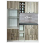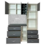 - Una torre con una altura de 2.10m, 60 cm de ancho, patas regulables, puertas abatibles, espacio para microondas de hasta 30 litros, horno de hasta 45 litros y 3 cajones tamaño estándar.