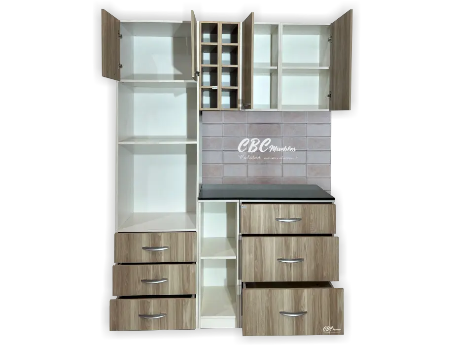 - La parte inferior cuenta con una mesada fórmica de color oscuro con espacio para realizar trabajos de cocina y zócalo con patitas regulables, con una altura de 90 cm y una profundidad de 52 cm. Además, cuenta con un espacio abierto con estantes y 3 cajones amplios con espacios para guardar cubiertos o mantelería.