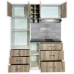 - Este mueble de cocina viene con la estructura MDP de color blanca cuenta con una Alacena de 60 cm de alto y una profundidad de 37 cm, con puertas color con espacio para guardar despensa, acompañado de un porta vinero y un espacio para instalar un porta extractor de hasta 70cm.
