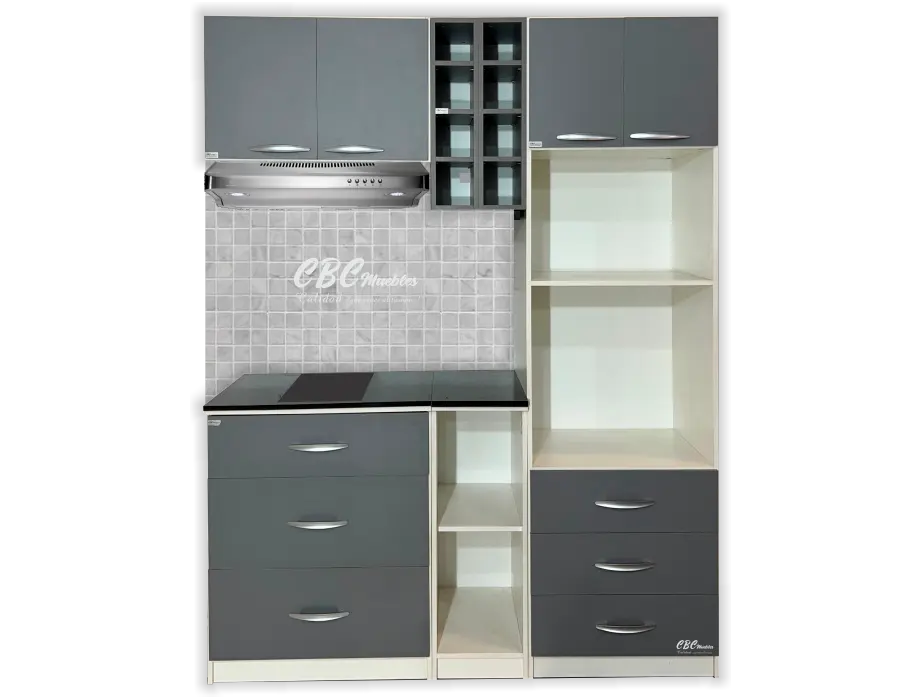 - La parte inferior cuenta con una mesada fórmica de color oscuro con espacio para colocar anafe de 60cm hasta 2 hornallas o 70cm hasta 4 hornallas y zócalo con patitas regulables, con una altura de 90 cm y una profundidad de 52 cm. Además, cuenta con un espacio abierto para especies o espacios decorativos y 3 cajones amplios o frece gran capacidad de guardado.