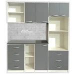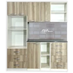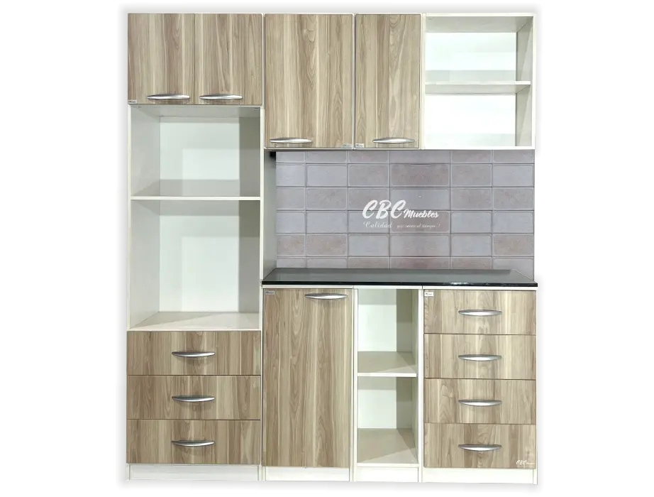 - Una torre con una altura de 2.10m, y 60cm de ancho con patas regulables y con puertas abatibles, espacio para microondas de hasta 30 Litros, el horno hasta 45 Litros dependiendo de la marca y tres cajones amplios.