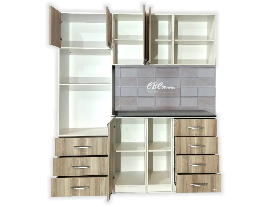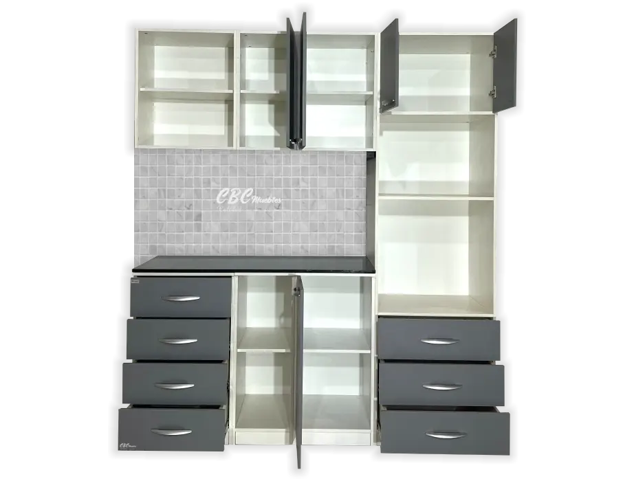 - La parte inferior cuenta con una mesada formica de color oscuro y zócalo con patitas regulables, con una altura de 90cm y con una profundidad de 52cm. Además, cuenta con cajones de tamaño estándar especial para ordenar tus utensilios, un espacio abierto con estantes y una puerta abatible que proporciona un espacio seguro para platos.