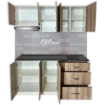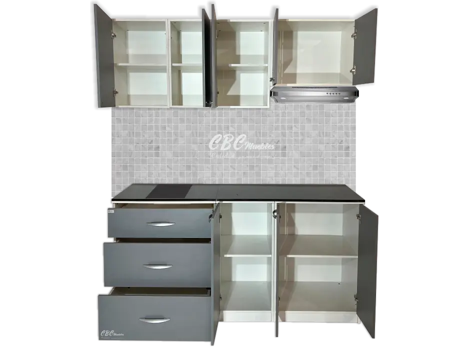 - La parte inferior cuenta con una mesada formica de color oscuro con espacio para colocar anafe de 60cm hasta 2 hornallas o 70 cm hasta 4 hornallas y zócalo con patitas regulables, con una altura de 90cm y con una profundidad de 52cm. Además, cuenta con puertas abatibles con espacios amplios ideal para productos de limpieza o recipientes grandes y 3 cajones amplios para mantener en orden los utensilios de cocina.