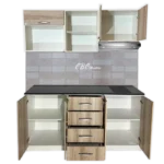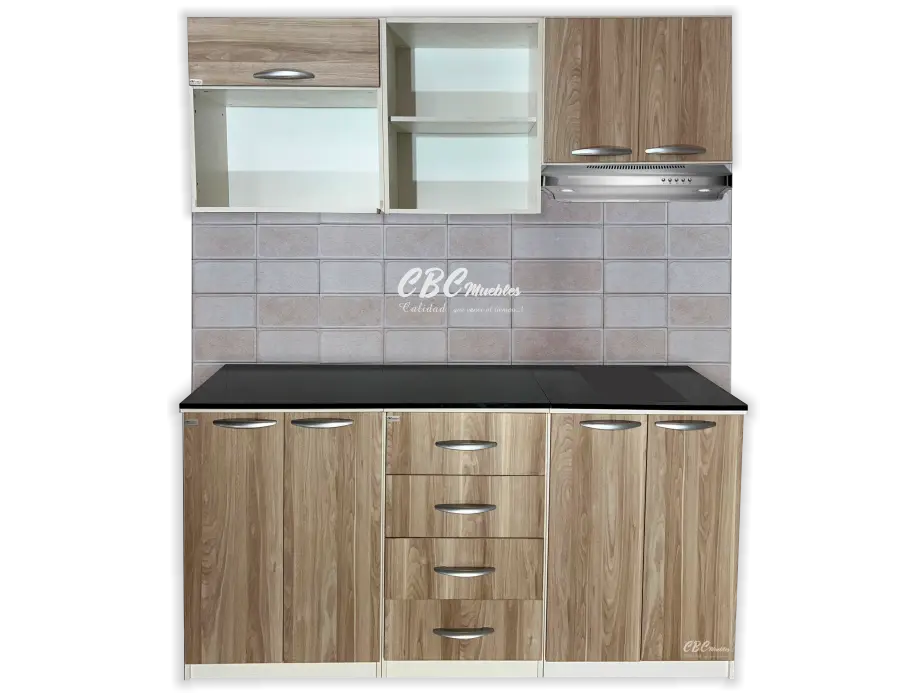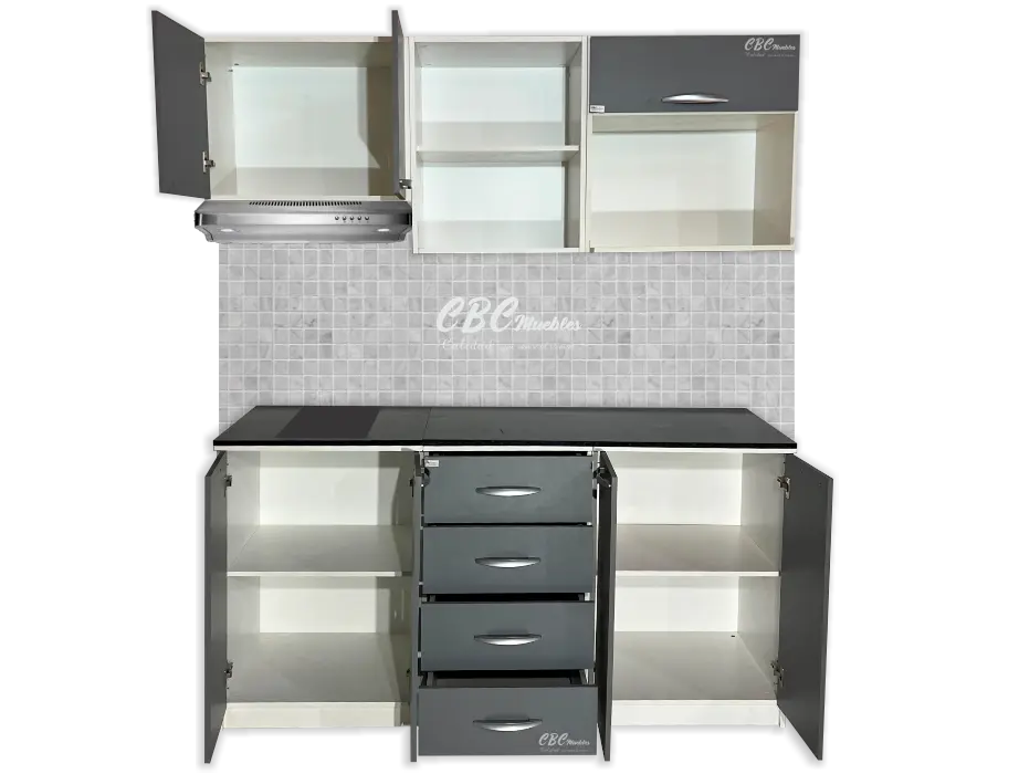 - La parte inferior cuenta con una mesada formica de color oscuro con espacio para colocar anafe de 60cm hasta 2 hornallas o 70cm hasta 4 hornallas y zócalo con patitas regulables, con una altura de 90cm y con una profundidad de 52cm. Además, cuenta con puertas abatibles con espacios amplios ideal para productos de limpieza o recipientes grandes y cajones de tamaño estándar en la parte central.