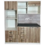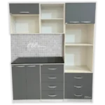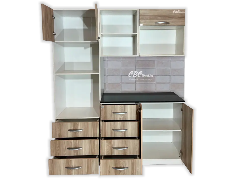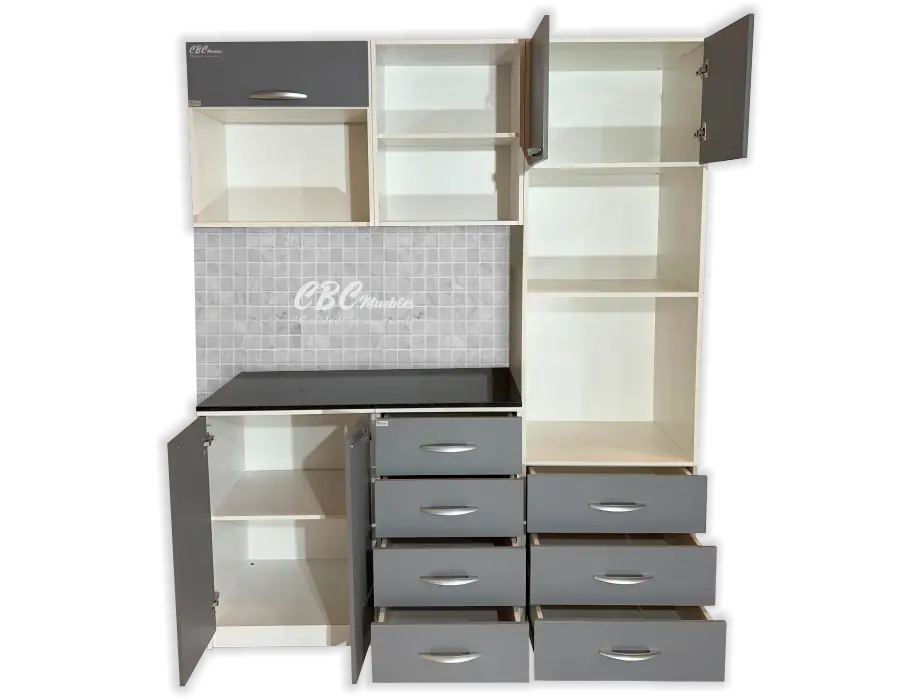 - Una torre con una altura de 2.10m, y 60cm de ancho con patas regulables y con puertas abatibles, espacio para microondas de hasta 30 Litros, el horno hasta 45 Litros dependiendo de la marca y tres cajones amplios.