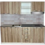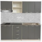 - La parte inferior cuenta con una bacha, mesada formica de color oscuro con espacio para colocar anafe de 60cm hasta 2 hornallas o 70cm hasta 4 hornallas y zócalo con patitas regulables, con una altura de 90cm y con una profundidad de 52cm.