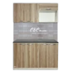 - La parte inferior cuenta con una mesada fórmica de color oscuro y zócalo con patitas regulables, con una altura de 90 cm y una profundidad de 52 cm. Además, cuenta con amplias puertas abatibles ideal para sartenes o recipientes grandes.