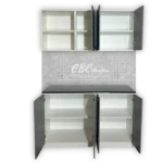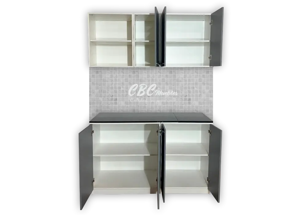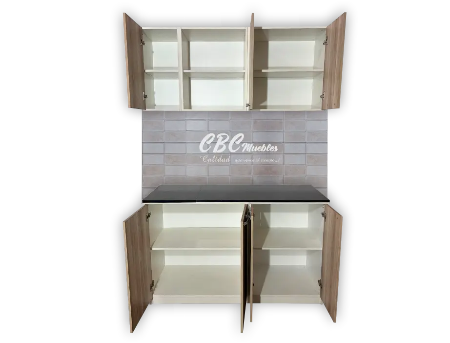 - La parte inferior cuenta con una mesada fórmica de color oscuro y zócalo con patitas regulables, con una altura de 90 cm y una profundidad de 52 cm. Además, cuenta con amplias puertas abatibles especial para recipientes grandes o productos de limpieza.