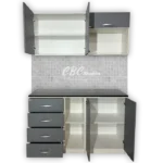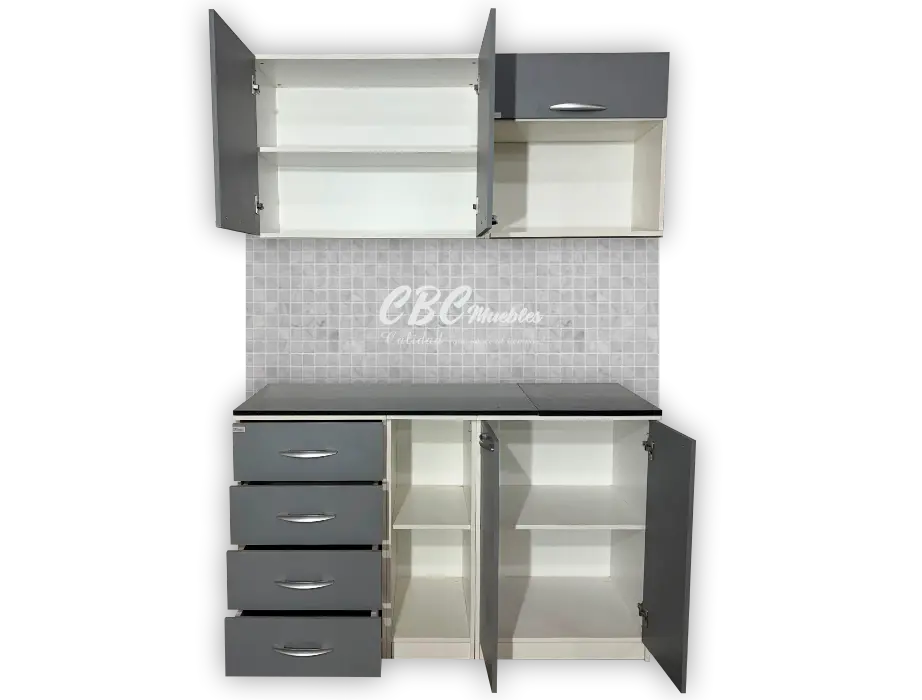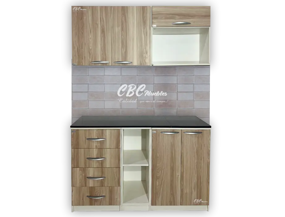 - La parte inferior cuenta con una mesada de color oscuro y un zócalo con patitas regulables, con una altura de 90 cm y con una profundidad de 52 cm. Además, cuenta con puertas abatibles y con 4 cajones tamaño estándar para el almacenamiento de utensilios de cocina y un espacio abierto con estantes.