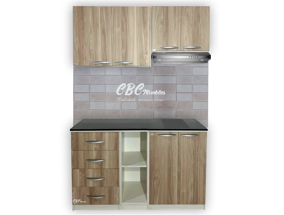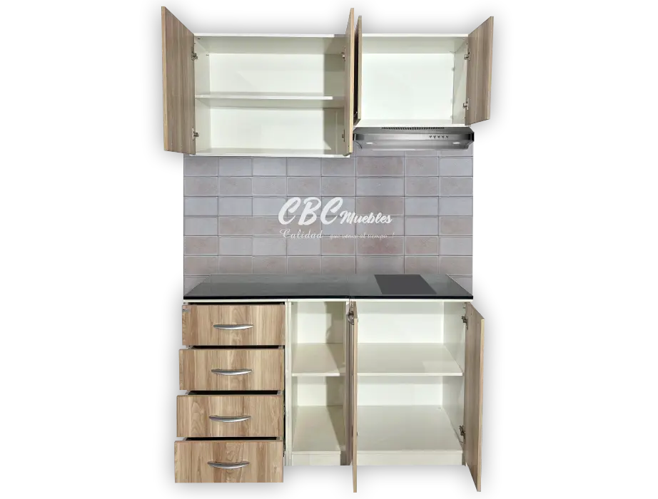 - Además, cuenta con 4 cajones tamaño estándar, espacio libre con estantes para electrodomésticos pequeños o utensilios de uso diario y dos puertas abatibles.