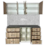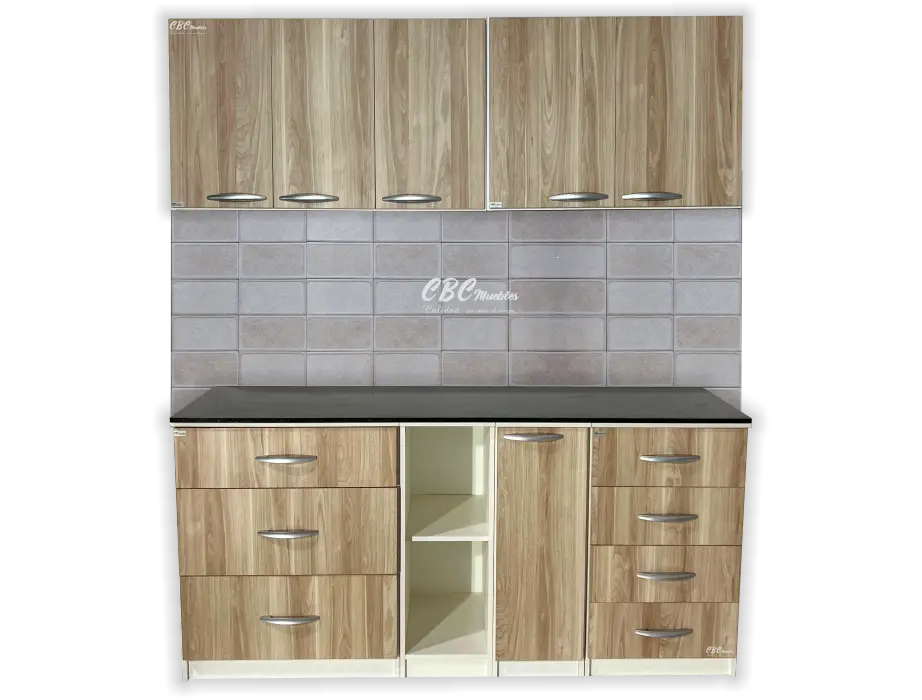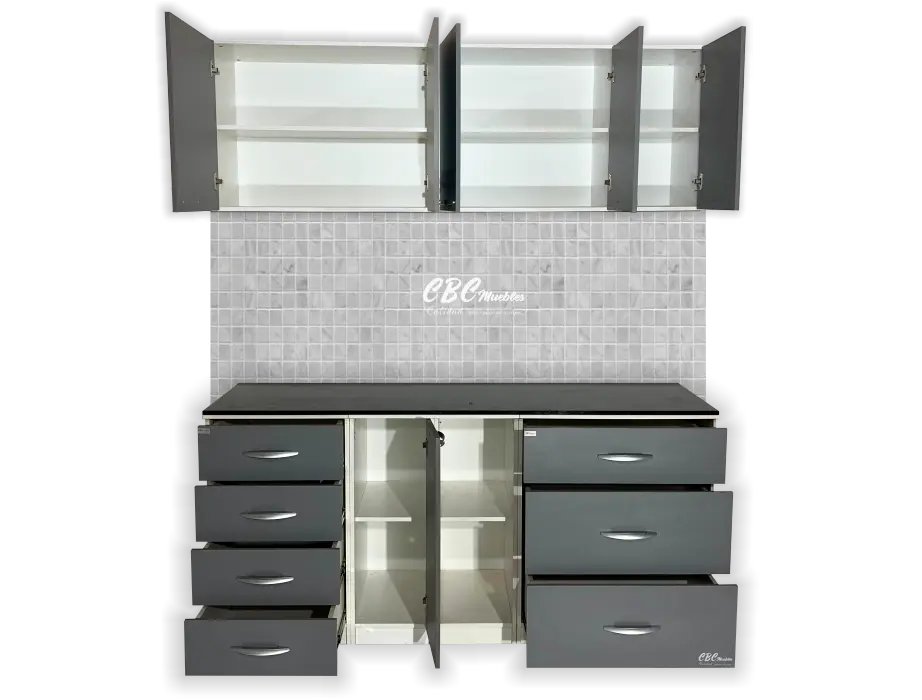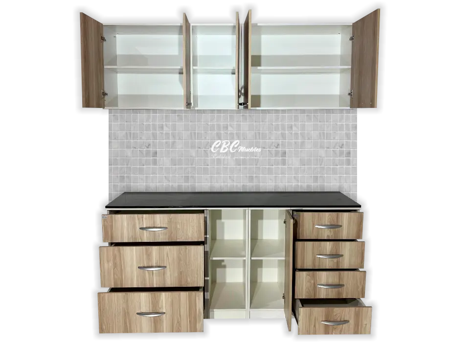 - Además, cuenta con 3 cajones amplios, 3 cajones tamaño estándar especial para ordenar tus utensilios, una puerta abatible y un espacio abierto con estantes.