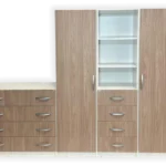 - Por otro lado, cuenta con una cómoda de 85cm de altura y una profundidad de 50cm, con una superficie blanca que puede ser utilizado como espacio decorativo, acompañado de 4 cajones amplios con guías telescópicas que ayuda en el orden de las medias, ropas interiores o accesorios,