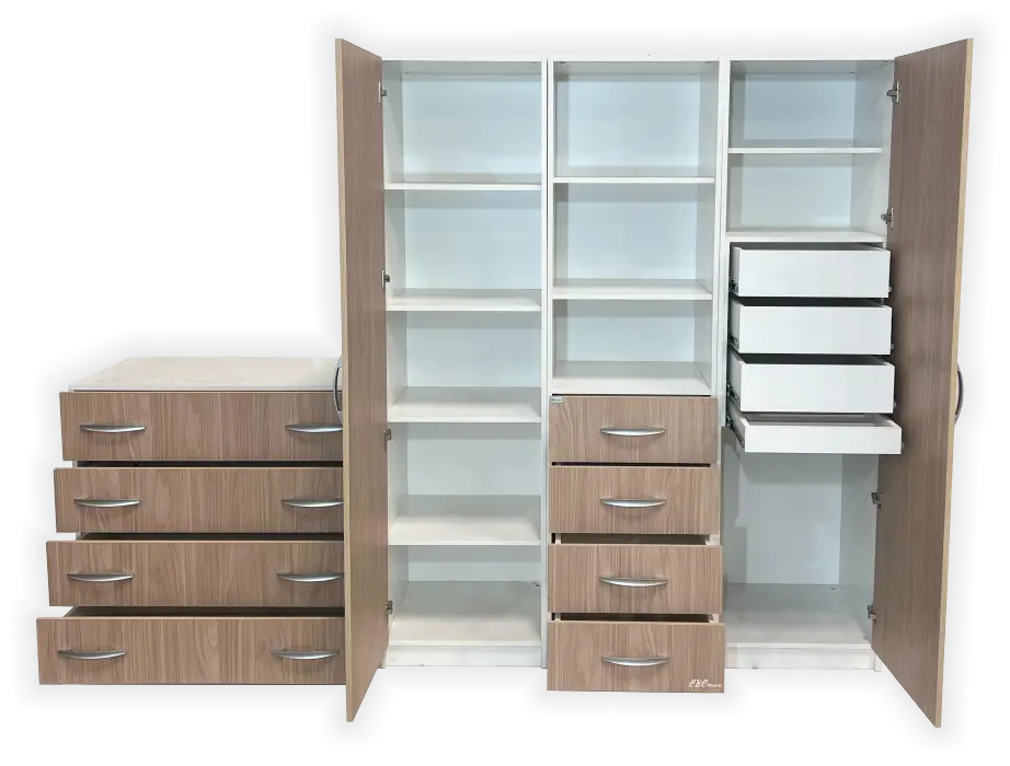 - Al centro cuenta con una estantería abierta que aporta accesibilidad con espacio para objetos personales, acompañado de 4 cajones amplios con guías telescópicas ideal para colocar calzados.