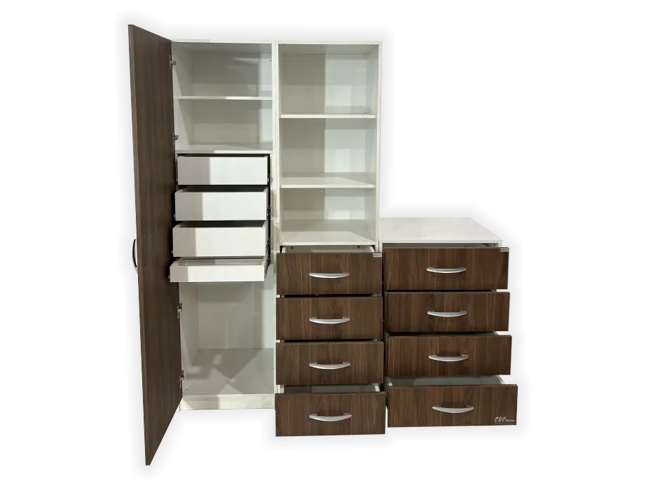 - A su costado cuenta con una estantería abierta con espacio para colocar prendas dobladas y 4 cajones que pueden ser utilizados para colocar calzados como botas, tacos o zapatos.