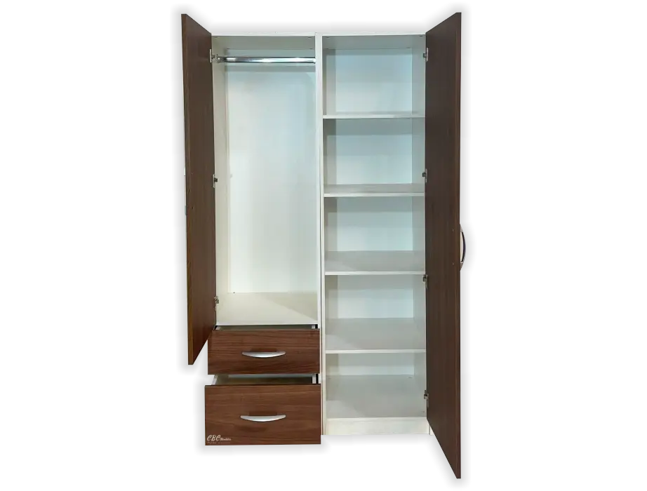 - Este ropero viene con una estructura MDP de color blanca con una altura de 1,80m y una profundidad de 50cm, con dos puertas color y zócalo con patitas regulables.