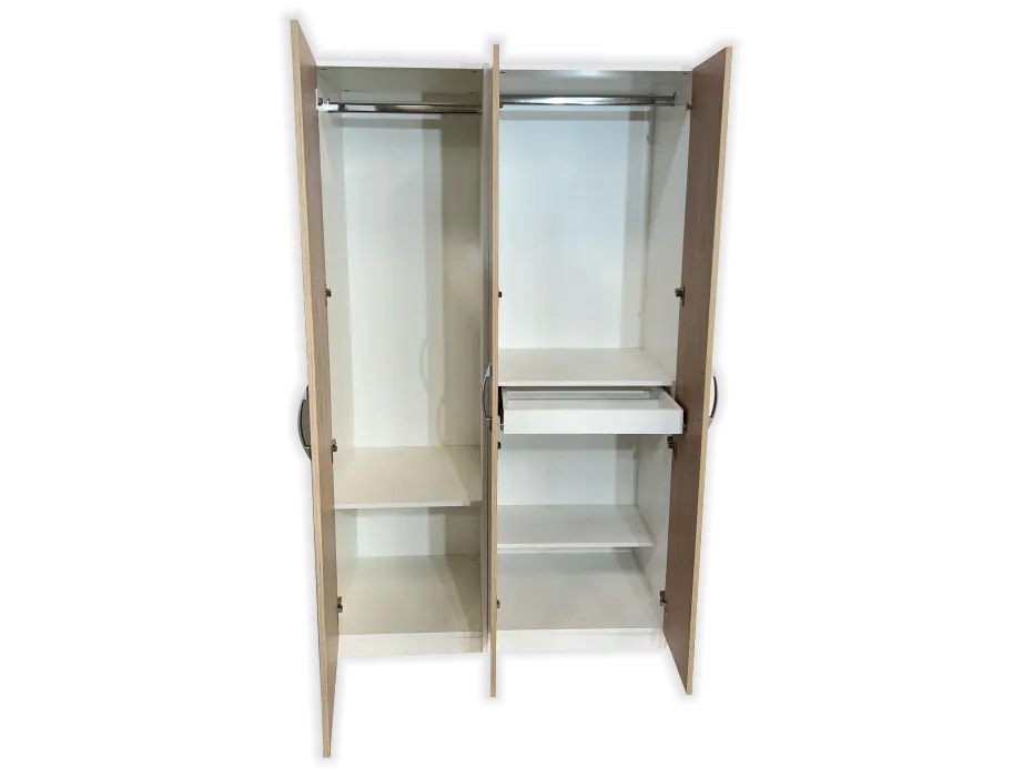 - En su interior cuenta con 2 percheros galvanizados que te permiten mantener ordenado uniformes de trabajo o ropa recién planchada, acompañado de estantes internos y una pantalonera con capacidad para colgar varios pantalones evitando arrugas en ellos.