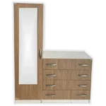 - Por otro lado, cuenta con una cómoda de 85cm de altura y una profundidad de 50cm, con una superficie blanca que puede ser utilizado como espacio decorativo, acompañado de 4 cajones amplios con guías telescópicas que ayuda en el almacenamiento de las prendas más pequeñas o accesorios personales.